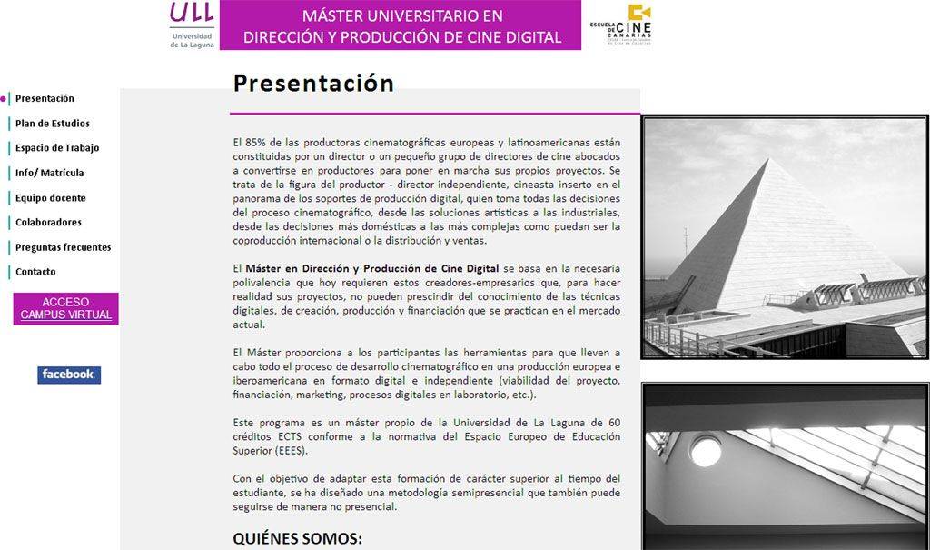 La Universidad de La Laguna y el Centro de Estudios de Cine de Canarias ponen en marcha el Máster en Dirección y Producción de Cine Digital, que se impartirá entre los meses de marzo y diciembre de 2012. Este programa formativo prima una visión amplia y globalizadora de los distintos pilares sobre los que se asienta la industria del cine actualmente. Por ello, sus contenidos recogen las estrategias de producción, tecnología digital, exhibición, distribución, promoción, marketing y ventas, además de las relativas al marco normativo y empresarial.