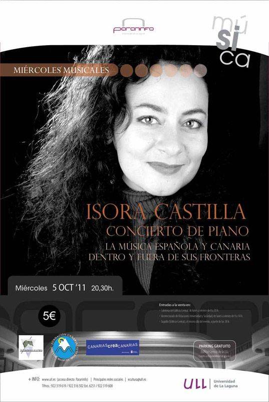 La Universidad de La Laguna los convoca mañana, miércoles 5 de octubre a las 20:30 horas en el Paraninfo (Edificio Central), al concierto de la pianista Isora Castilla, enmarcado en el ciclo de Miércoles Musicales. Esta artista, que actualmente es profesora en el Bern Konservatorium (Berna), trae al recinto universitario un repertorio en el que destaca la música española y canaria fuera y dentro de sus fronteras.
