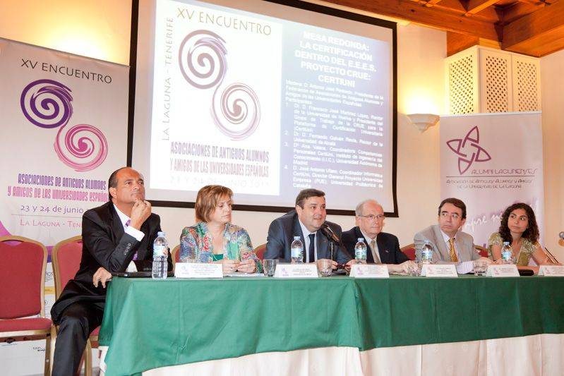 El XV Encuentro de Asociaciones de Antiguos Alumnos y Amigos de Universidades Españolas que se celebra en La Laguna hasta hoy, viernes 24 de junio, desarrolló su segunda mesa redonda, dedicada a indagar en los procesos de certificación dentro del Espacio Europeo de Educación Superior y, más concretamente, sobre el proyecto Plataforma de Certificación Universitaria CertiUni promovido por la Conferencia de Rectores de Universidades Españolas (CRUE).