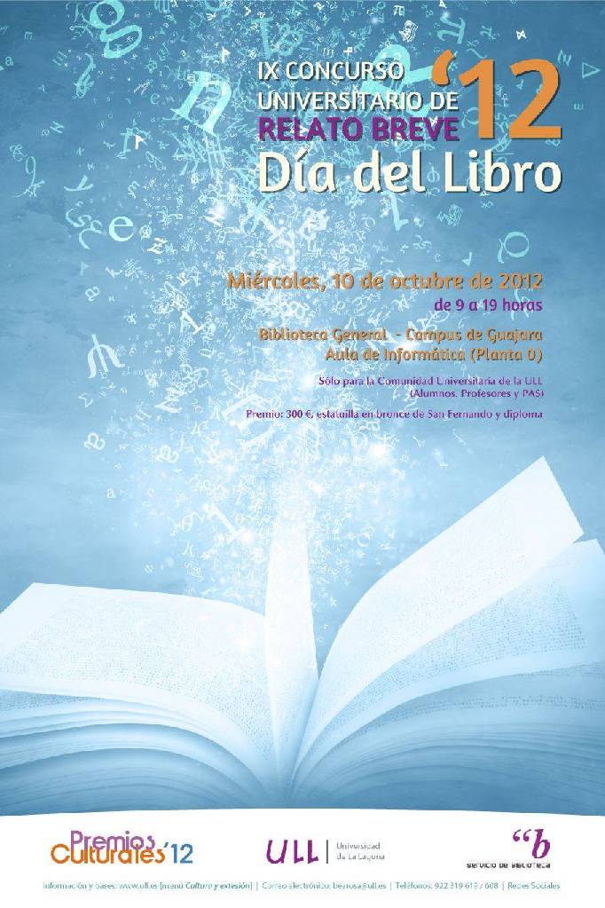La Universidad de La Laguna celebrará mañana miércoles 10 de octubre en la Biblioteca General y de Humanidades del campus de Guajara la novena edición del Premio Relato Breve del “Día del libro”, en el que podrán participar los alumnos, personal docente e investigador y personal administrativo y de servicios de la institución académica.