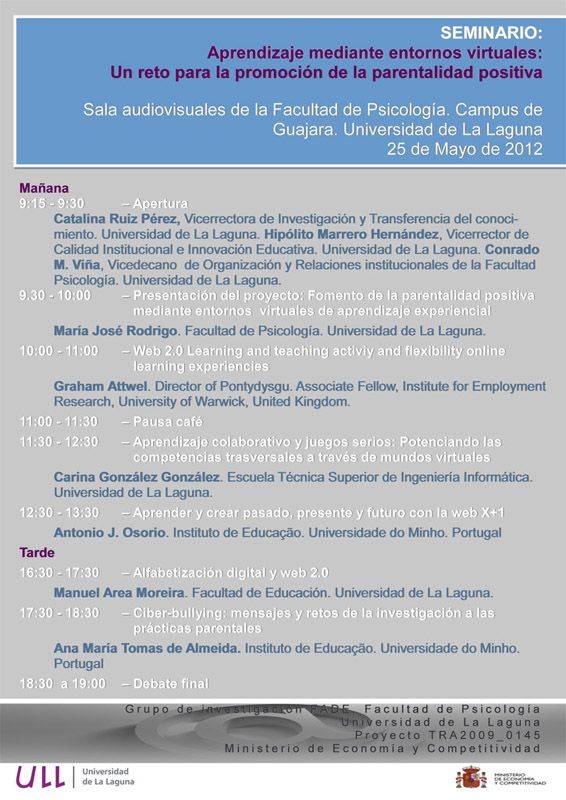 En primer lugar, se presentará el proyecto “Fomento de la parentalidad positiva mediante entornos virtuales de aprendizaje experiencial”, a cargo de María José Rodrigo, del Departamento de Psicología Evolutiva y de la Educación. A continuación tendrá lugar la conferencia titulada “Web 2.0 learning and teaching activity and flexibility online learning experiences”, que impartirá Graham Attwel, investigador del proyecto Pontydysgu de la Universidad de Warwick, del Reino Unido.