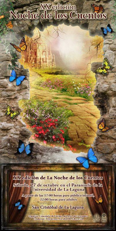 El Paraninfo de la Universidad de La Laguna acoge mañana sábado 27 de octubre la vigésima edición de “La Noche de los Cuentos”, organizada por el grupo Toysteatro. Se celebrarán dos sesiones de este espectáculo, la primera a las 17:00 horas dirigida al público infantil, y la segunda a las 22:00 horas, para un público adulto.