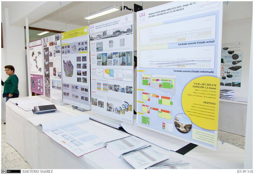 La Escuela Universitaria de Arquitectura Técnica de la Universidad de La Laguna ha inaugurado recientemente una exposición sobre los Proyectos Fin de Grado presentados por los estudiantes durante el curso 2012/2013. Los trabajos se alejan de la idea de la mera construcción, y así en la muestra se incluyen obras relacionadas con la rehabilitación, análisis y de mejora de edificios existentes, desarrollo de planes directores de gestión vinculados a la sostenibilidad y a la accesibilidad, aplicación y puesta en marcha de nuevas herramientas informáticas en el campo de la sostenibilidad, desarrollo de proyectos de demolición y de urbanización y propuestas y análisis de la viabilidad económica de estos proyectos.