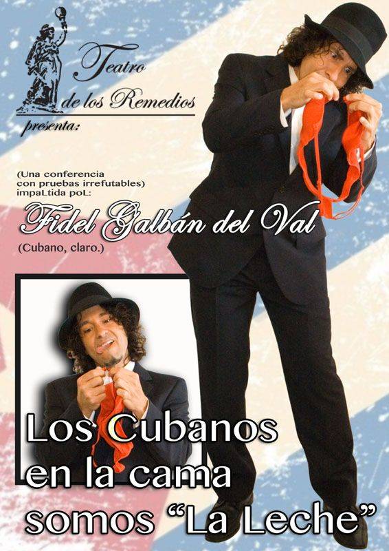 “Los cubanos en la cama somos la leche” narra la historia de dos personajes. Uno es el típico colorista cubano que inunda los programas de prensa rosa: el clásico juerguista, oportunista y descarado, un superviviente a cualquier precio. Este personaje hace uso y abuso verbal de sus atributos y cualidades sexuales. Él nos cuenta, en verso, sus aventuras y desventuras para salir de Cuba y llegar a España.