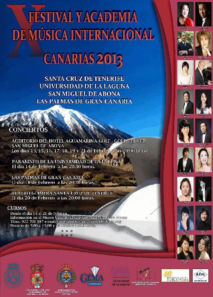 El X Festival y Academia de Música Internacional de Canarias es un evento que se celebrará a lo largo del mes de febrero en varias sedes de Granadilla de abona, Las Palmas de Gran Canaria, Santa Cruz de Tenerife y La Laguna. El Paraninfo de la Universidad de La Laguna será la sala que acoja la velada prevista para mañana jueves, 14 de febrero a las 20:30 horas, en la que participarán músicos de Corea, Italia, Alemania y Canarias.