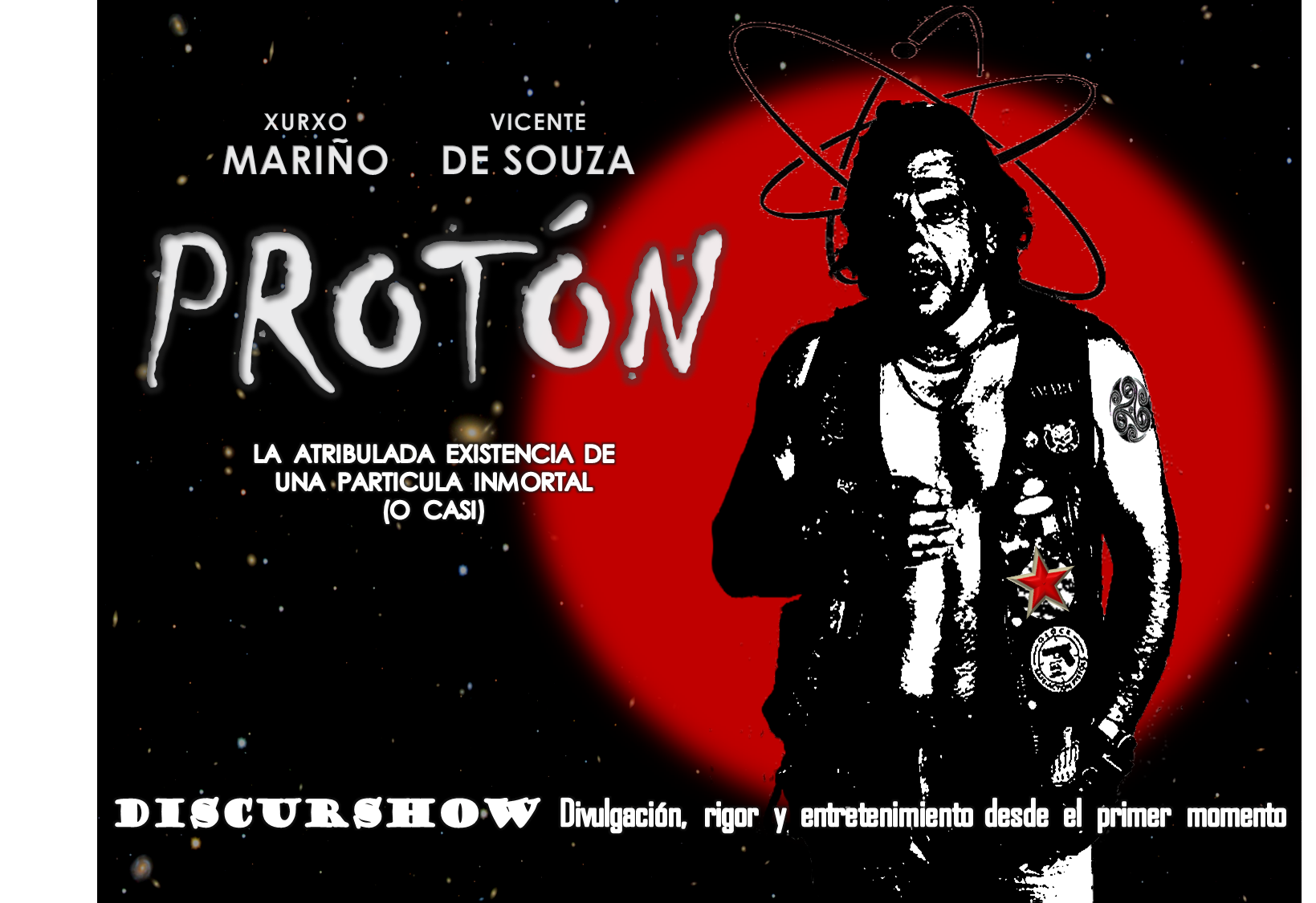 El estreno en Canarias de este nuevo formato procedente de Santiago de Compostela tendrá lugar el viernes 14 de junio a las 20.30 horas en el Aguere Espacio Cultural de La Laguna, después de haber pasado por ciudades como Madrid, Bilbao o Palma de Mallorca. Bajo el título “Discurshow Protón. La atribulada existencia de una partícula inmortal (o casi)”, Xurxo Mariño y Vicente de Souza viajarán desde las primeras moléculas y átomos que formaron el mundo hasta los límites del Cosmos, al comienzo de todo, para comprender mejor el universo actual. El precio de la entrada es de 4 euros por persona.