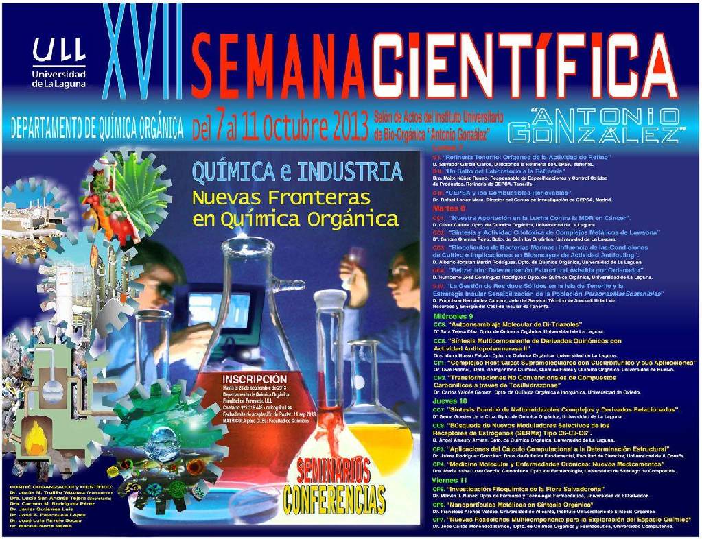 El acto inaugural se celebrará el lunes 7 a las 9:30 horas, y contará con la presencia del rector de la ULL, Eduardo Doménech; la vicerrectora de Investigación y Transferencia de Conocimiento de la ULL, Catalina Ruiz; el consejero de Economía, Competitividad e Innovación del Cabildo de Tenerife, Antonio García Marichal; y el director del Departamento de Química Orgánica de la ULL, Jesús Trujillo Vázquez.