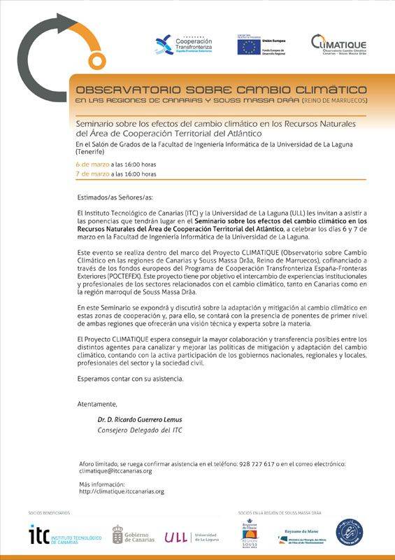 La Universidad de La Laguna acogerá el “Seminario sobre los efectos del cambio climático en los Recursos Naturales del Área de Cooperación Territorial del Atlántico” los días 6 y 7 de marzo. Este curso, organizado conjuntamente por el Instituto Tecnológico de Canarias (ITC) y la ULL, se celebra en el marco del proyecto europeo CLIMATIQUE y pretende encontrar formas de adaptación al cambio climático en las regiones de Canarias y Souss Massa Drâa, en Marruecos.