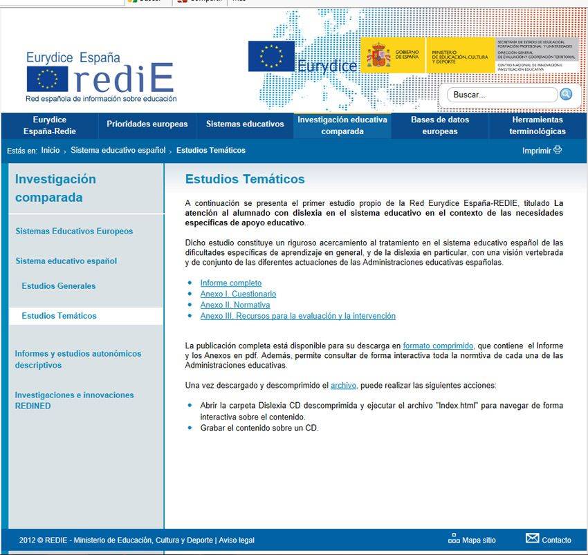 http://www.mecd.gob.es/redie-eurydice/Investigacion-comparada/Sistema-educativo-espanol/Estudios-tematicos.html. La publicación completa está disponible para su descarga en formato comprimido, que contiene el informe y los anexos en pdf. Además permite consultar de forma interactiva toda la normativa de cada una de las administraciones educativas.
