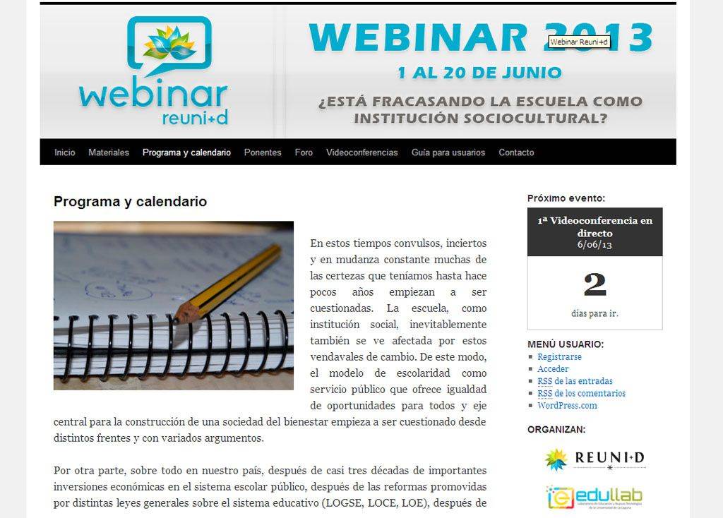 El grupo de investigación Laboratorio de Educación y Nuevas Tecnologías de la Universidad de La Laguna (EDULLAB), coordinado por el profesor Mauel Area y ubicado en la Facultad de Educación, ha organizado un seminario a través de Internet, también denominado “webinar”, cuyo título es: “¿Está fracasando la escuela como institución sociocultural?”. En él se han inscrito más de 200 expertos e investigadores de diferentes países latinoamericanos y se está desarrollando entre el 1 y el 20 de junio en esta página web.