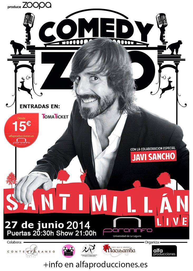 El Paraninfo de la Universidad de La Laguna acoge mañana, viernes 27 de junio, a partir de las 21:00 horas el espectáculo Santi Millán Live!, donde el actor de la nueva serie de Telecinco El Chiringuito de Pepe estará acompañado del humorista Javi Sancho.