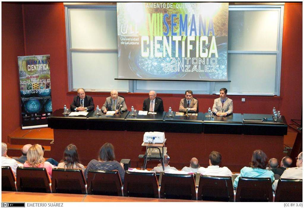 La celebración de la Semana científica Antonio González, organizada por el Departamento de Química Orgánica de la Universidad de La Laguna, es ya una de las citas más consolidadas en el seno de la institución académica, que en 2014 alcanza su décimo octava edición. Este foro ha sido inaugurado hoy, miércoles 8 de octubre en el salón de actos del Instituto de Bio-Orgánca Antonio González, y se desarrollará hasta el viernes con un programa que combina las conferencias de reconocidos especialistas nacionales en la materia con las sesiones de presentación de pósteres sobre investigación.