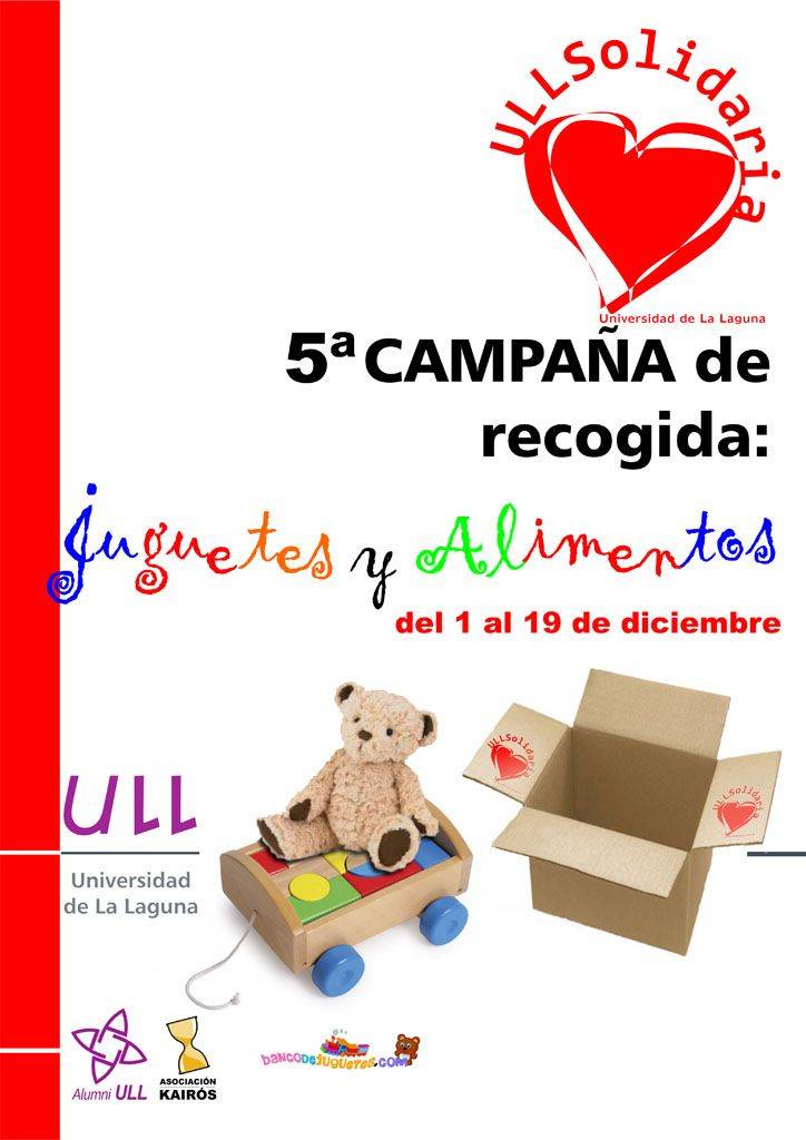 La iniciativa institucional ULL Solidaria ha puesto en marcha su quinta campaña de recogida de alimentos y juguetes, que se abrió el pasado 1 de diciembre y permanecerá activa hasta el día 19 del mismo mes. En esta ocasión, se colabora con las organizaciones Banco de Juguetes y Asociación Kairós Tenerife. (Ver videonoticia).