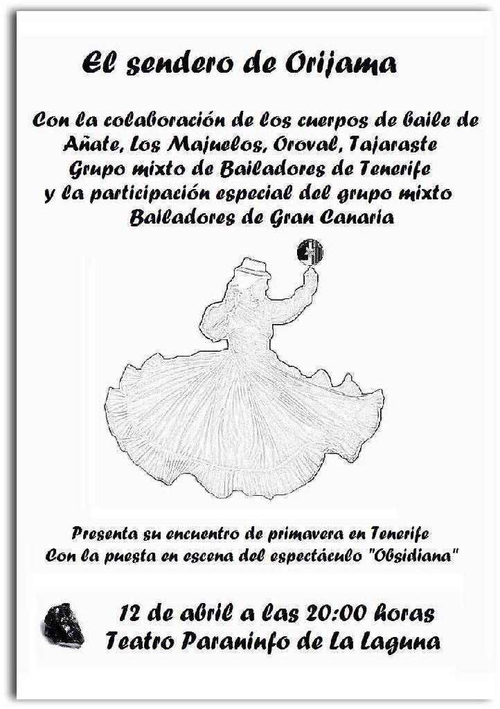 La Asociación Cultural Sendero de Orijama organiza esta velada en la que participarán las formaciones Añate, Los Majuelos, Oroval, Tajaraste, y los grupos mixtos de bailadores de Tenerife y de Gran Canaria. Este espectáculo folclórico pretende dar a conocer la cultura tradicional canaria a través de sus bailes más representativos.