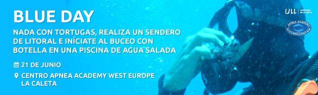 El Servicio de Deportes de la Universidad de La Laguna y el centro Apnea Academy West Europe han organizado conjuntamente el Blue Day, una actividad en la que se combina la iniciación al buceo con el senderismo y la posibilidad de nadar entre tortugas marinas. Tras el éxito cosechado por la primera convocatoria celebrada en mayo, mañana sábado 21 de junio se desarrollará una nueva jornada a partir de las 9:30 en el centro de buceo co-organizador, ubicado en Adeje.