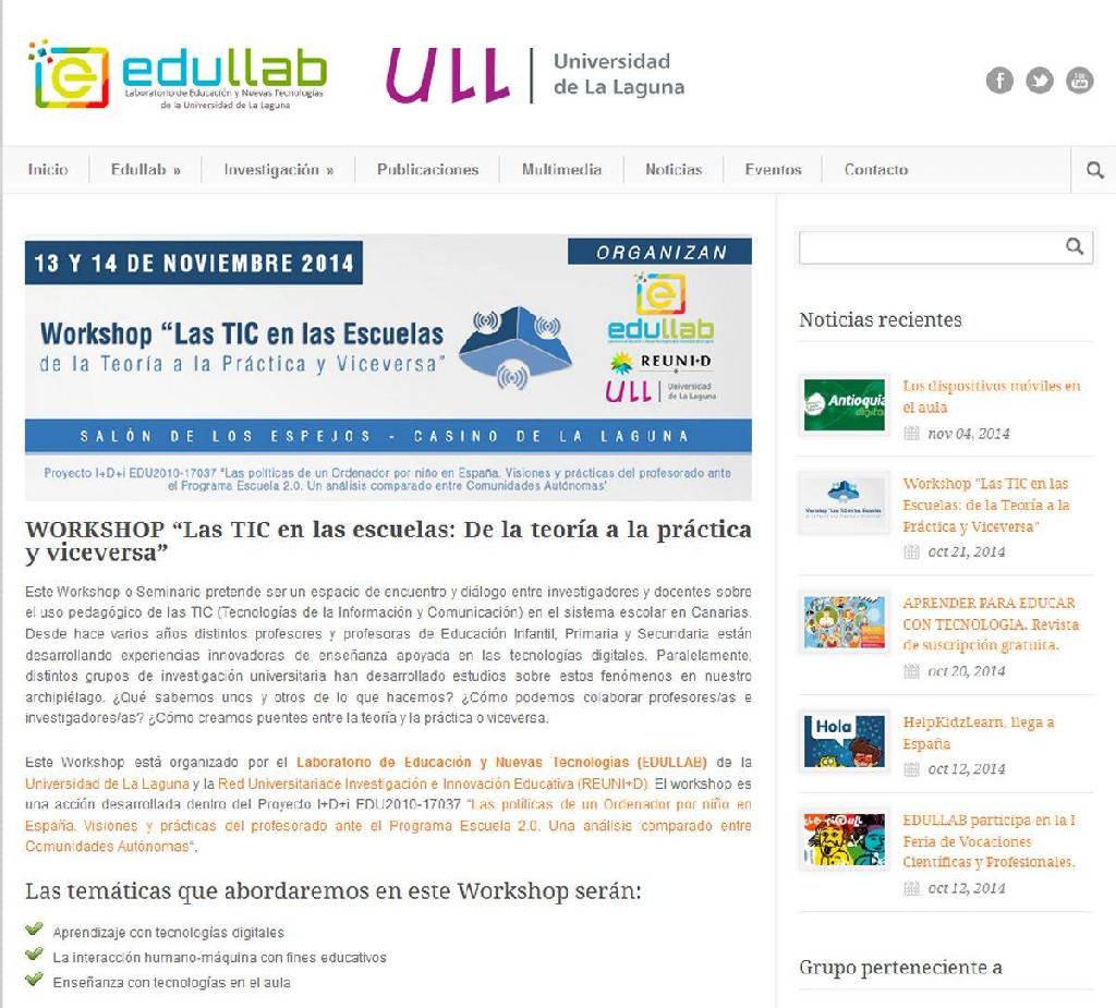 El Laboratorio de Educación y Nuevas Tecnologías de la Universidad de La Laguna (Edullab) ha organizado el seminario “Las TIC en las escuelas: de la teoría a la práctica y viceversa”, que se desarrollará la próxima semana, los días 13 y 14 de noviembre, en el Casino de La Laguna.