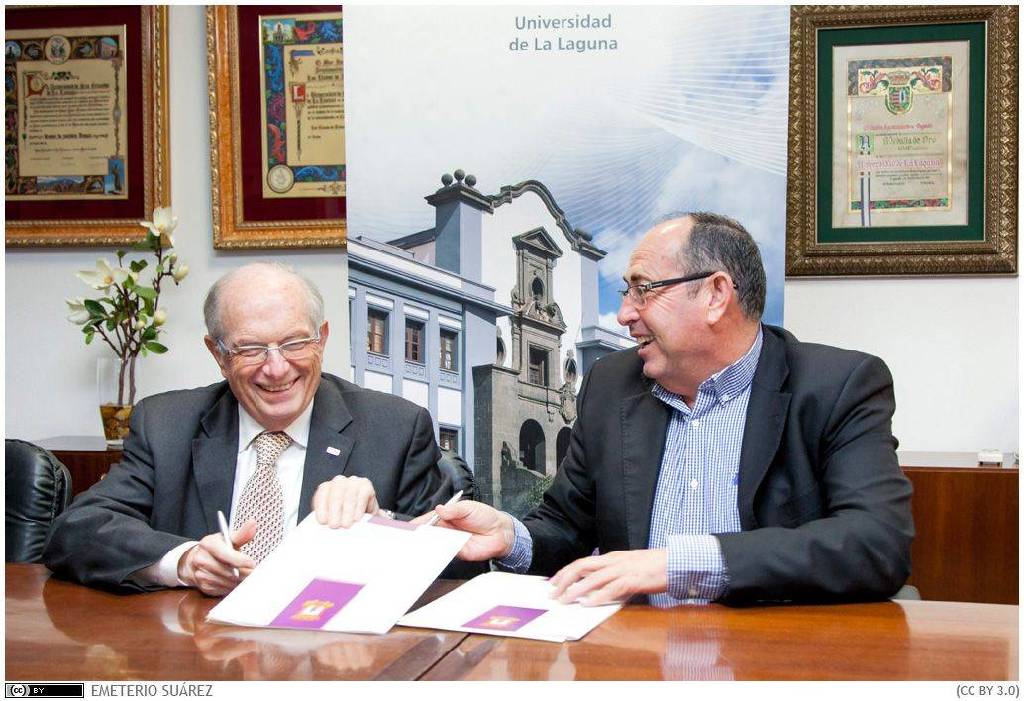 El rector de la Universidad de La Laguna, Eduardo Doménech, y el alcalde del ayuntamiento de El Sauzal, Mariano Pérez, firmaron hoy viernes 5 de diciembre un convenio marco de colaboración que da cobertura formal a las varias líneas de cooperación que sendas instituciones mantienen en vigor.