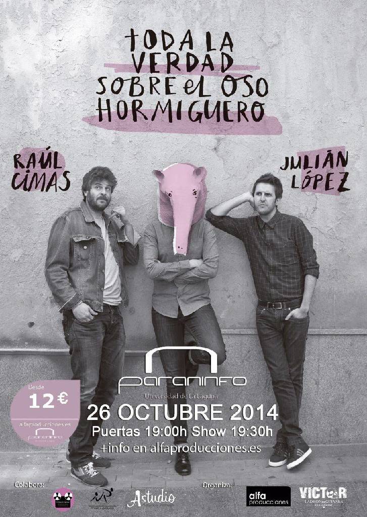 Los humoristas Julián López y Raúl Cimas presentarán su show “Toda la verdad sobre el oso hormiguero” el domingo 26 de octubre a las 19:30 horas en el Paraninfo de la Universidad de La Laguna. Las entradas están a la venta desde 12 euros en www.tomaticket.es y en la taquilla del Paraninfo el mismo día de la actuación, una hora antes de su inicio. Los asistentes disponen de estacionamiento gratuito en el aparcamiento del Edificio Central.