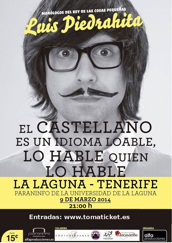 El cómico Luis Piedrahita actuará el domingo 9 de marzo a las 21:00 horas en el Paraninfo de la Universidad de La Laguna, en la que será su única actuación en Tenerife, con el monólogo “El castellano es un idioma loable, lo hable quien lo hable”.
