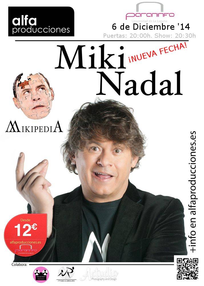 El polifacético humorista Miki Nadal llevará al Paraninfo de la Universidad de La Laguna su espectáculo “Mikipedia” mañana sábado 6 de diciembre, a las 20:30 horas. La función que tuvo que ser aplazada a finales de noviembre se trasladó a esta nueva fecha y se enmarca dentro de la programación cultural de la Noche en Blanco en La Laguna.