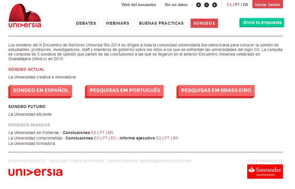 En el marco de su III Encuentro Internacional de Rectores, el portal Universia invita a toda la comunidad universitaria de España, Portugal y América Latina a aportar su visión sobre el presente y futuro de la universidad mediante sondeos que se pueden responder en http://participa.universiario2014.com/index/sondeos.