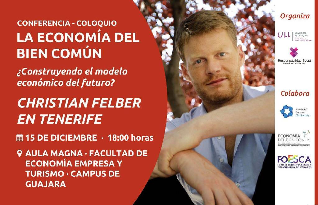 Christian Felber, promotor de la Economía del Bien Común, un concepto extendido ya en 40 países, impartirá una conferencia el próximo martes 15 de diciembre en la Universidad de La Laguna, en el Aula Magna de la Facultad de Economía, Empresa y Turismo a las 18 horas, tras la que tendrá lugar un coloquio moderado por la periodista María Fresno en el que intervendrán, profesionales de la comunicación, profesores universitarios y el público asistente. En la web www.ull.es/rsocial está disponible el enlace al formulario de inscripción.
