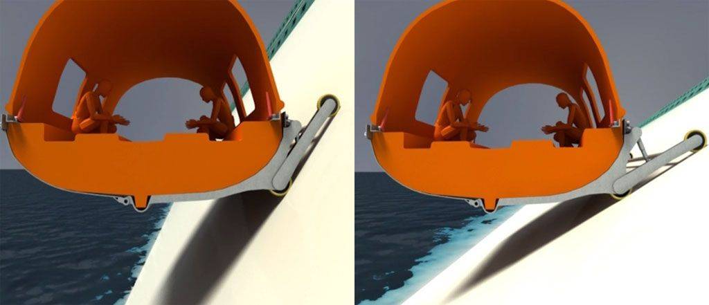 Como explican los propios diseñadores, hasta la fecha, en casos de accidentes en buques que provoquen una gran escora, como ocurrió en el caso del Costa Concordia, se corre un gran riesgo de no poder usar los botes en una de las bandas. Cuando esta escora supera los 20 grados, no puede garantizarse en condiciones de seguridad el arriado de los botes salvavidas situados en la banda opuesta al sentido de la inclinación del buque. Esto se debe a que su costado interfiere durante el proceso de arriado, dejando los botes de esa banda inutilizados.