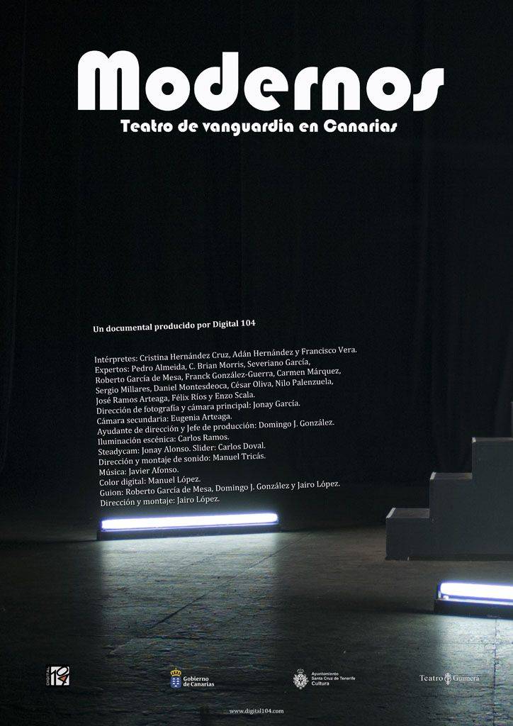 “Modernos. Teatro de vanguardia en Canarias”, rodado en localizaciones de Tenerife, Gran Canaria, Murcia y Castellón -entre ellas, el propio Paraninfo ULL-, cuenta con el trabajo de profesionales de Canarias como Javier Afonso en la música original; Carlos Ramos en la iluminación escénica; Manuel López en la posproducción de imagen y color digital; o Manuel Tricás en el sonido; que se unen a la labor de los cuatro miembros de Digital 104 y al propio Roberto García de Mesa, encargado de realizar las entrevistas.