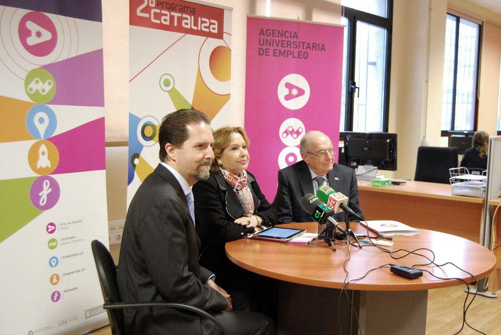 El rector de la Universidad de La Laguna, Eduardo Doménech, y la consejera de Empleo del Gobierno de Canarias, Francisca Luengo, acompañada del director del Servicio Canario de Empleo, Alejandro Martín, presentaron hoy, miércoles 11 de febrero, el balance de resultados del conjunto de acciones desarrollado a través de la Agencia Universitaria de Empleo, cuya financiación ha corrido a cargo del Servicio Canario de Empleo.