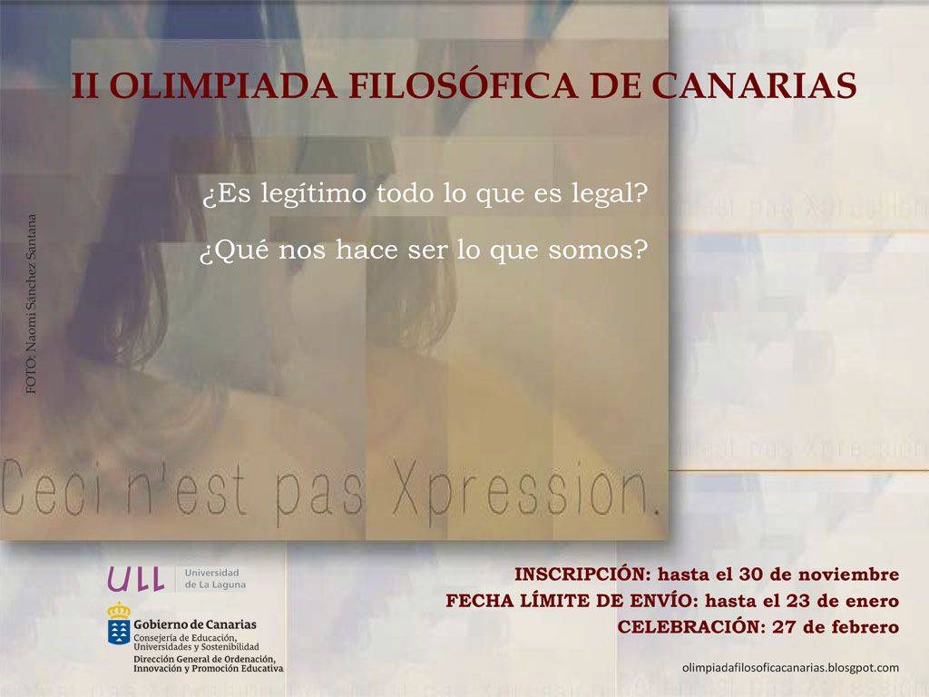 En la modalidad de fotografía filosófica han participado 40 alumnos, entre cuyas obras se han escogido las 21 fotografías que formarán parte de una exposición que recorrerá distintas salas del archipiélago el próximo curso escolar. Asimismo, la fotografía ganadora, procedente de la Escuela de Arte Manolo Blahnik de Santa Cruz de La Palma, ilustrará el cartel oficial de la tercera edición de las Olimpiadas Filosóficas de Canarias, que se celebrarán durante el próximo curso 2015-2016.
