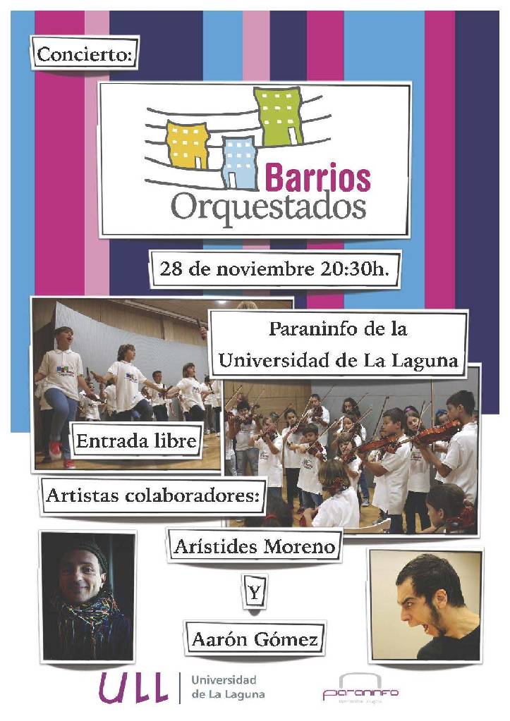 La Noche en Blanco de La Laguna, que se celebrará mañana sábado 28 de noviembre, acoge dentro de su amplia programación el concierto “Barrios Orquestados” que tendrá lugar en el Paraninfo de la Universidad de La Laguna a partir de las 20:30 horas y cuya entrada es gratuita hasta completar aforo. En el concierto participarán el humorista Aarón Gómez, además de Arístides Moreno que será el maestro de ceremonias como ya es tradición.