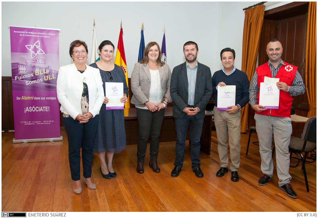 Por Cruz Roja recibió el cheque Rubén González; por Banco de Alimentos, Fernando Serrano; y finalmente por Cáritas Diocesana, Rosa María González. La presidenta de Alumni ULL, Carmen Pitti, declaró que este dinero surge de las cuotas de los propios socios y que en todo caso corresponde a un premio de solidaridad entre estudiantes que, al quedar desierto en la edición de este año, se decidió repartirlo entre entidades que cubren necesidades de la población en riesgo de exclusión social.
