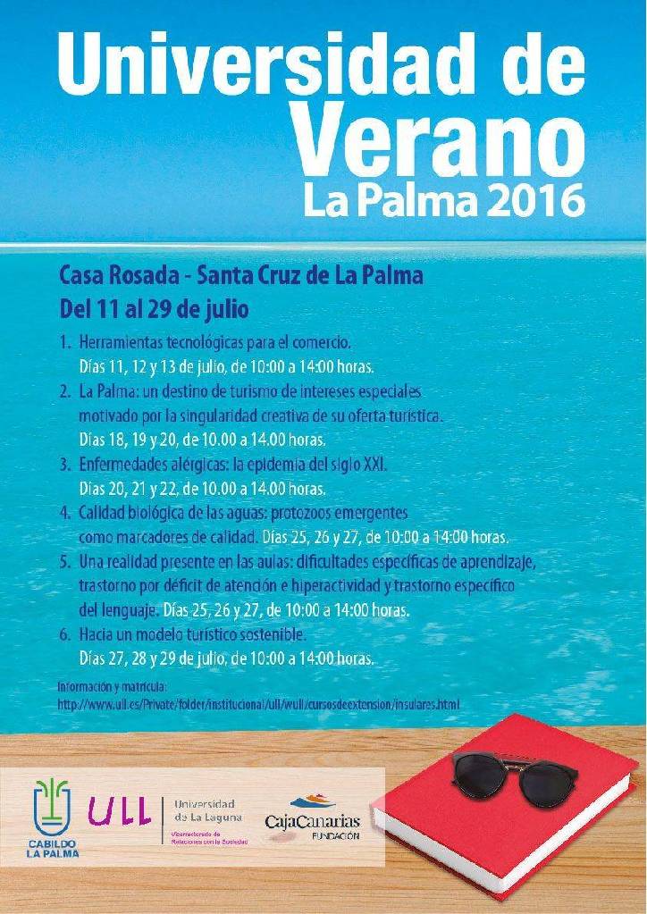 Dentro de su política de extensión universitaria, y enmarcado en su programa Universidades Insulares de Verano, la Universidad de La Laguna y el Cabildo Insular de La Palma han desarrollado un programa de cursos estivales que se desarrollan a lo largo del mes de julio. Dos de ellos ya se han impartido y aún quedan plazas disponibles para los cuatro restantes. La matrícula tiene un coste de 12 euros cada seminario y puede formalizarse a través de Internet hasta el mismo día de inicio de cada uno, en la web: www.ull.es/cursosdeextension.
