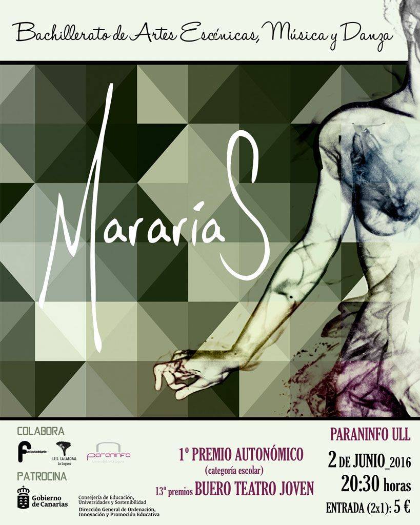 El grupo de Bachillerato de Artes Escénicas, Música y Danza del IES La Laboral de La Laguna escenificará mañana, jueves 2 de junio a las 20:30 horas en el Paraninfo, la obra “Mararías”, con la que obtuvo recientemente el primer premio de la décimo tercera edición del Premio Autonómico Premios Buero Teatro Joven.