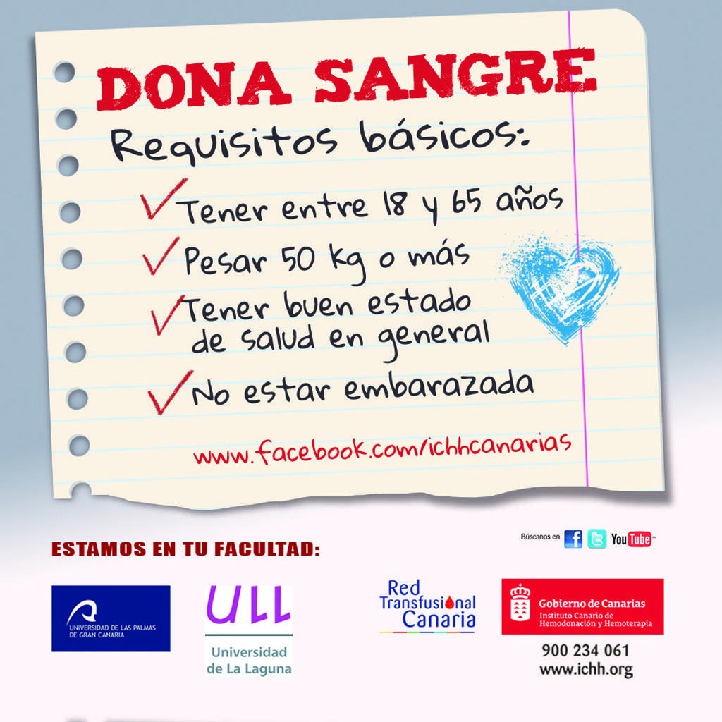 El Instituto Canario de Hemodonación y Hemoterapia, dependiente de la Consejería de Sanidad del Gobierno de Canarias, comienza este lunes 26 de septiembre su campaña de donación de sangre en la Universidad de La Laguna, que se prolongará hasta el 11 de octubre. Contará con la colaboración de estudiantes de la institución académica que, dentro del proyecto ULL Solidaria, apoyan la labor de promoción de esta iniciativa.
