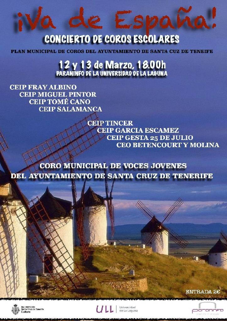 Alrededor de 330 cantores pertenecientes a diversos coros escolares se reunirán el sábado 12 y domingo 13 de marzo en el Paraninfo de la Universidad de La Laguna en el concierto “¡Va de España!”: La sesión comenzará a las 18:00 horas con entradas a 2 euros, que podrán adquirirse en la taquilla el mismo día de la función. La gala tendrá una hora aproximada de duración y su repertorio estará formado por temas compuestos por músicos españoles.
