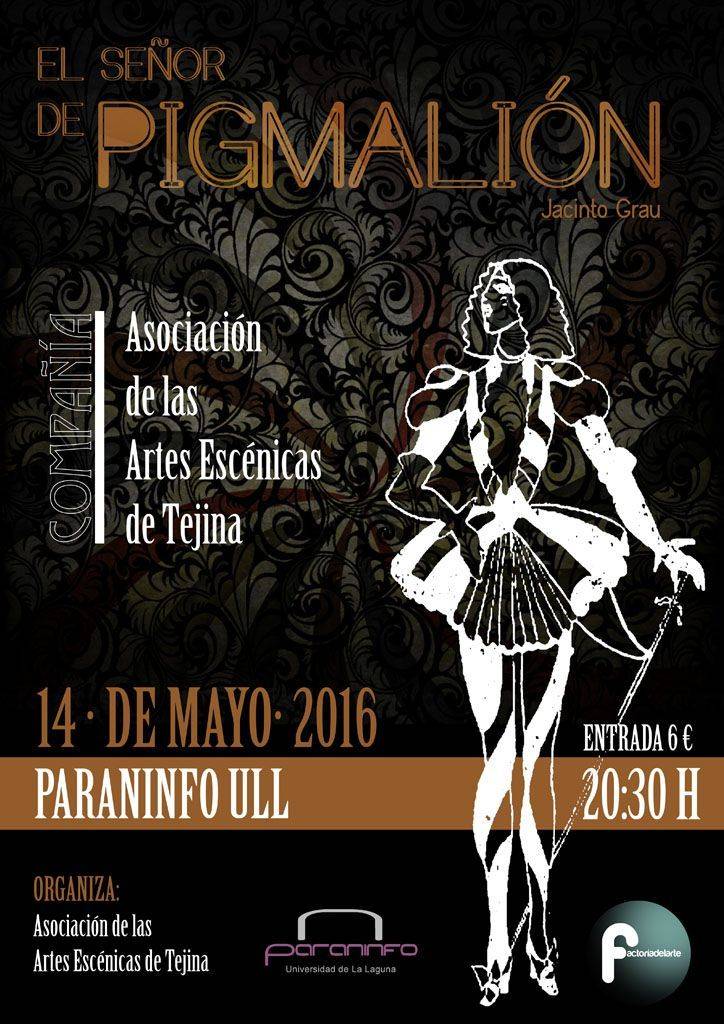 La Asociación de Artes Escénicas de Tejina representará mañana, sábado 14 de mayo a las 20:30 horas, la obra “El señor de Pigmalión”, de Jacinto Grau alcanzó un gran éxito. Las localidades para este espectáculo están a la venta al precio de 6 euros en www.tomaticket.es/paraninfoull y en la taquilla del Paraninfo el mismo día de la función, a partir de las 19:30 horas.