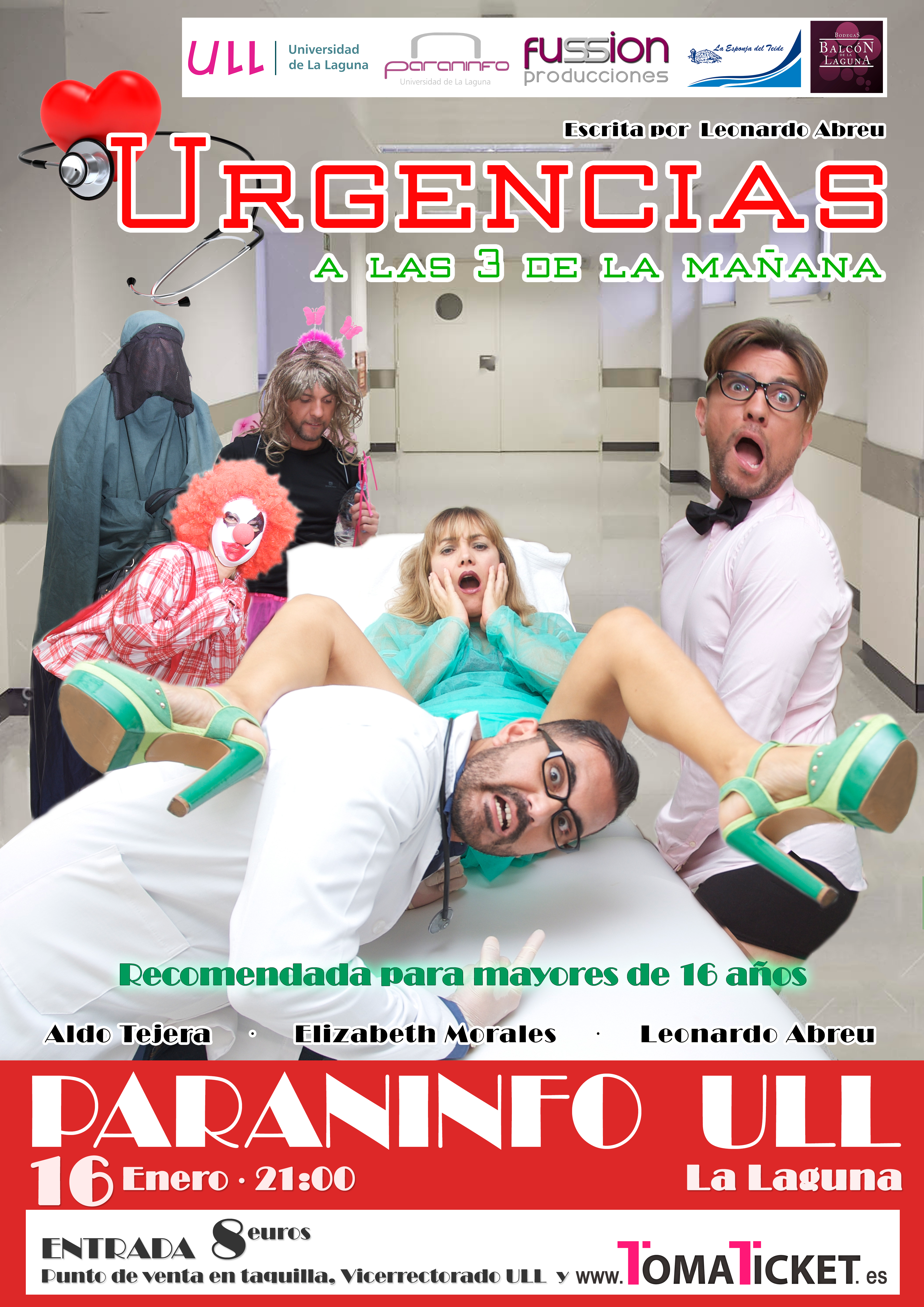 La obra “Urgencias a las 3 de la mañana” escrita e interpretada por Leonardo Abreu, acompañado de Elizabeth Morales y Aldo Tejera, llegará mañana sábado 16 de enero a las 21 horas al Paraninfo de la Universidad de La Laguna de la mano de la compañía Fussion Teatro. Se trata de una comedia picante y divertida en la que el público reirá e incluso podrá sentirse identificado con algunos de los casos médicos que allí se muestran.