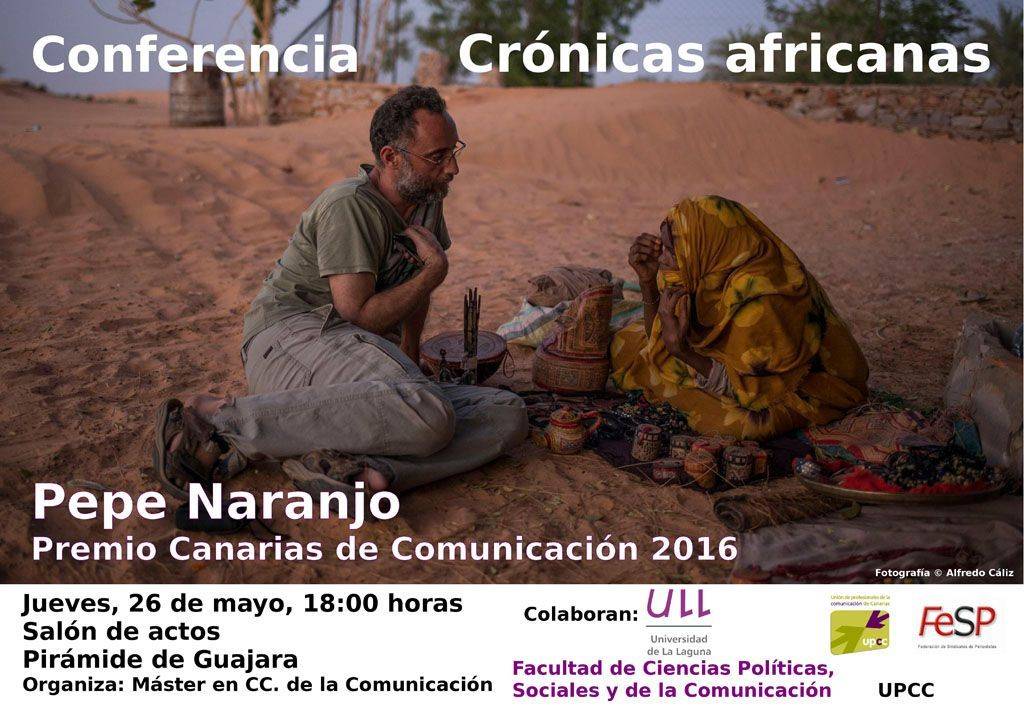 El Premio Canarias de Comunicación 2016, José Naranjo, ofrecerá mañana, jueves 26 de mayo, la conferencia “Crónicas Africanas” en el Salón de Actos de la Sección de Ciencias de la Información de la Facultad de Ciencias Políticas, Sociales y de la Comunicación. En esta charla, que será la primera en la que participe el periodista desde que se le concediera el galardón, hablará de su labor como corresponsal en el continente africano, narrando para diversos medios españoles la realidad que viven millones de personas en Senegal, Marruecos, Argelia, El Sáhara, Malí, Gambia, Cabo Verde, Sierra Leona, o Liberia.