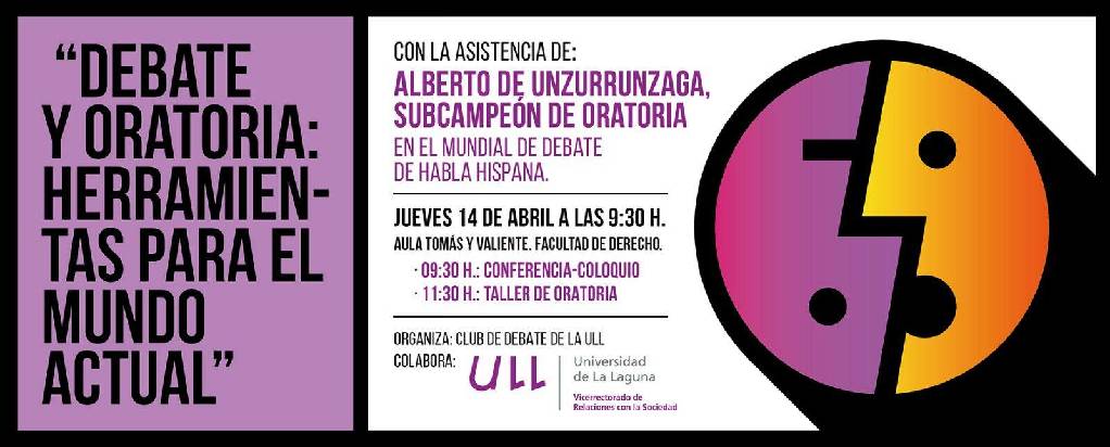 El Club de Debate de la Universidad de La Laguna, en colaboración con el Vicerrectorado de Relaciones con la Sociedad. organiza la charla-coloquio «Debate y oratoria: Herramientas para el mundo actual» en el que intervendrá el subcampeón de oratoria en el Mundial de Habla Hispana, Alberto Unzurrunzaga.