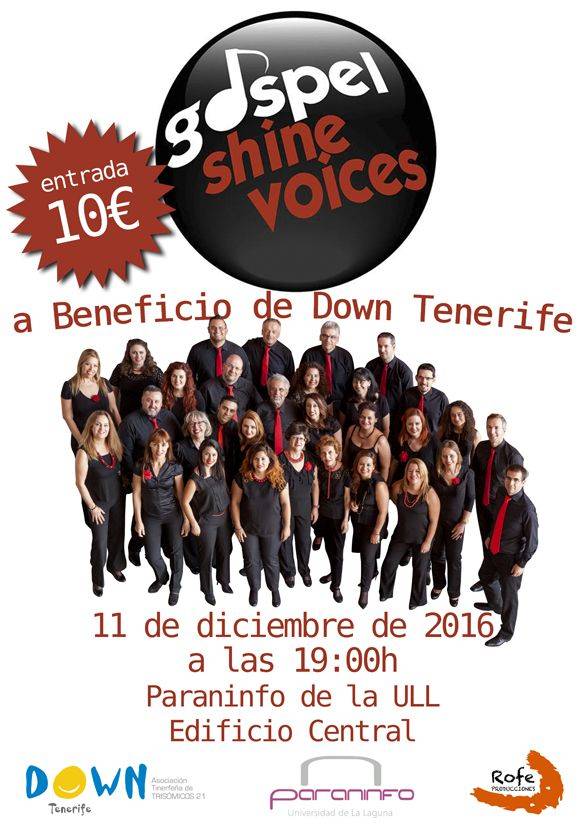 El Paraninfo de la Universidad de La Laguna acoge este domingo 11 de diciembre a partir de las 19:00 horas el concierto ofrecido por el Gospel Shine Voices, cuyos beneficios irán destinados a la organización no gubernamental Down Tenerife Trisómicos 21.