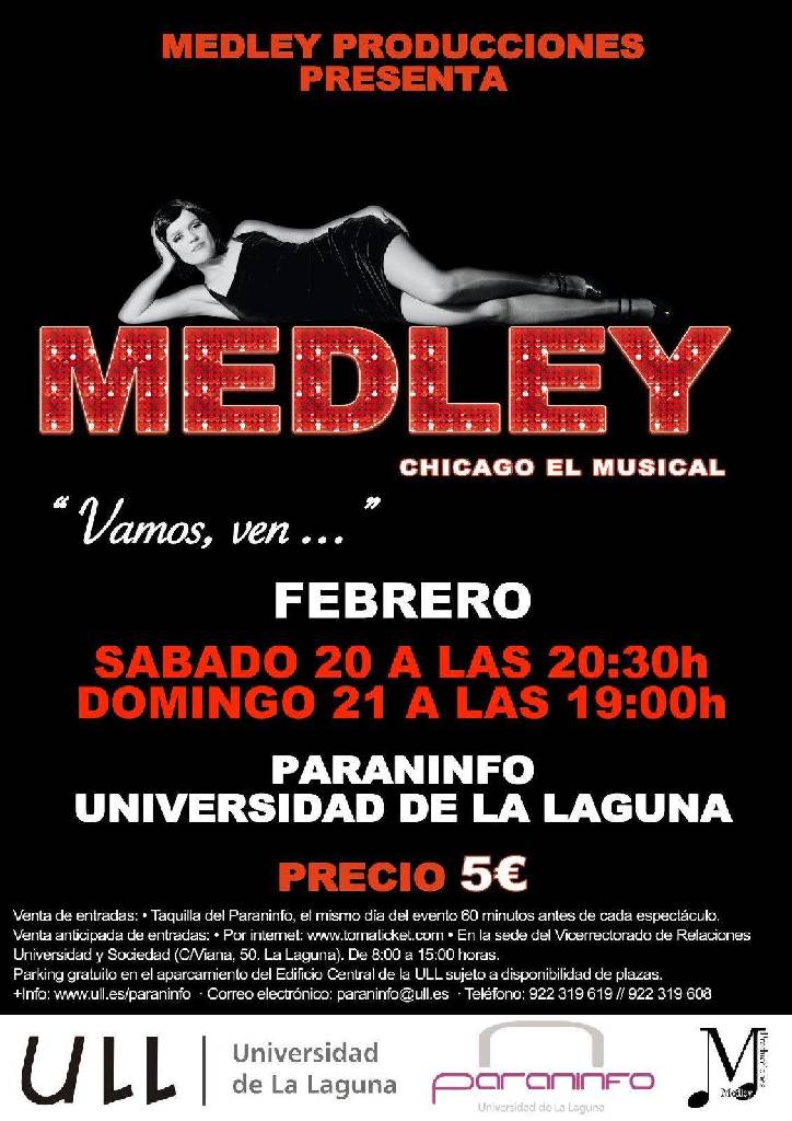 La programación cultural de febrero del Paraninfo de la Universidad de La Laguna incluye mañana sábado 20 de febrero a las 20:30 horas y el domingo 21 a las 19:00, la representación de la versión del célebre musical “Chicago” a cargo de la compañía Medley. Las entradas tienen un precio de 5 euros y dan derecho a aparcamiento gratuito en el Edificio Central de la institución académica.