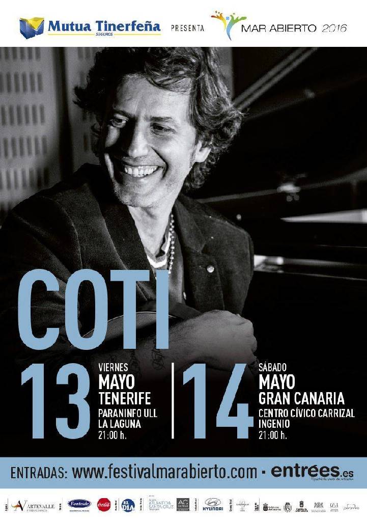 El Paraninfo de La Universidad de La Laguna acoge el regreso del artista internacional Coti a Tenerife. El concierto, que forma parte del Festival de Música del Mar y de la gira del artista “Cercanías y confidencias”, se celebrará tendrá mañana, viernes 13 de mayo, a las 21:00 horas, con entradas desde 18 euros en el portal www.entrees.es.