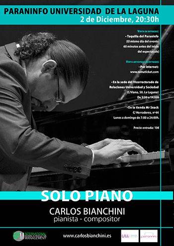 El pianista-compositor Carlos Bianchini ofrecerá el concierto “Solo Piano” mañana, viernes 2 de diciembre, a las 20:30 horas en el Paraninfo de la Universidad de La Laguna. Se trata de una actuación que forma parte de su gira nacional, que le ha llevado hasta Tenerife.