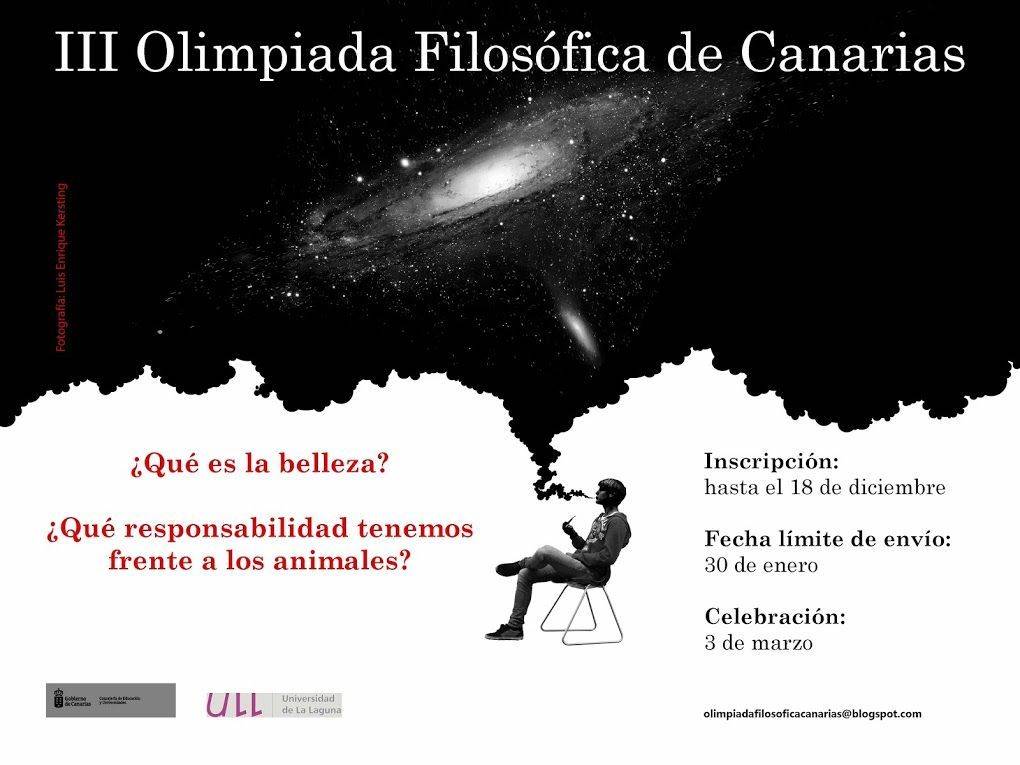 La Olimpiada Filosófica de Canarias es un proyecto dirigido al alumnado de Enseñanza Secundaria que pretende acercar la actividad filosófica a la realidad académica y personal de la comunidad estudiantil. La principal acción de este proyecto consiste en un certamen en el que se premia la capacidad del alumnado de ESO y Bachillerato para afrontar, de forma autónoma y crítica, problemas de índole filosófica que tienen una clara repercusión en la sociedad actual.