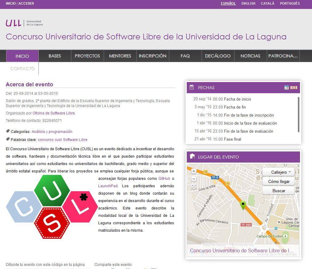 La Universidad de La Laguna celebrará mañana 21 de abril a las 15 horas en el Salón de Grados de la Escuela Superior de Ingeniería y Tecnología de la Sección de Ingeniería Informática, la entrega del VI Premio Local del Concurso Universitario de Software Libre, en el que participan cuatro finalistas que presentarán sus proyectos ante el público durante 10 minutos cada uno.