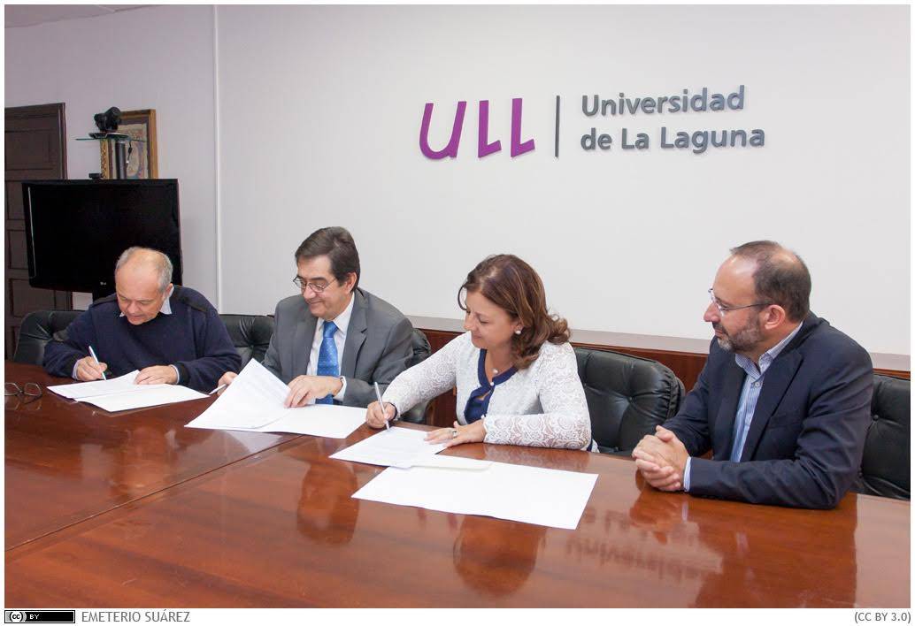 El rector de la Universidad de La Laguna, Antonio Martinón, la presidenta y el secretario general de la Asociación de Agricultores y Ganaderos (ASAGA Canarias ASAJA), Ángela Delgado y Hernán Tejera, respectivamente, y el director de la Fundación Canaria General de la ULL, Julio Antonio Brito, han firmado hoy viernes 11 de noviembre, un convenio marco de cooperación educativa mediante el que el alumnado puede realizar prácticas externas en empresas asociadas a esta organización profesional agraria.