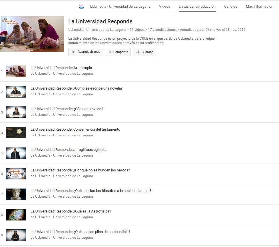 El proyecto audiovisual “La universidad responde” es una coproducción impulsada por la Conferencia de Rectores de las Universidades Españolas (CRUE) en la cual participan 34 instituciones académicas. Este proyecto, recientemente publicado a nivel nacional, está compuesto por 340 micro espacios audiovisuales de 120 segundos, en los que los investigadores e investigadoras de diferentes centros responden de manera breve y sencilla a una pregunta sobre descubrimientos, curiosidades o desarrollo tecnológico. La Universidad de La Laguna aporta una serie de diez vídeos a este proyecto nacional, que pueden verse en el Canal de ULLMedia en Youtube.