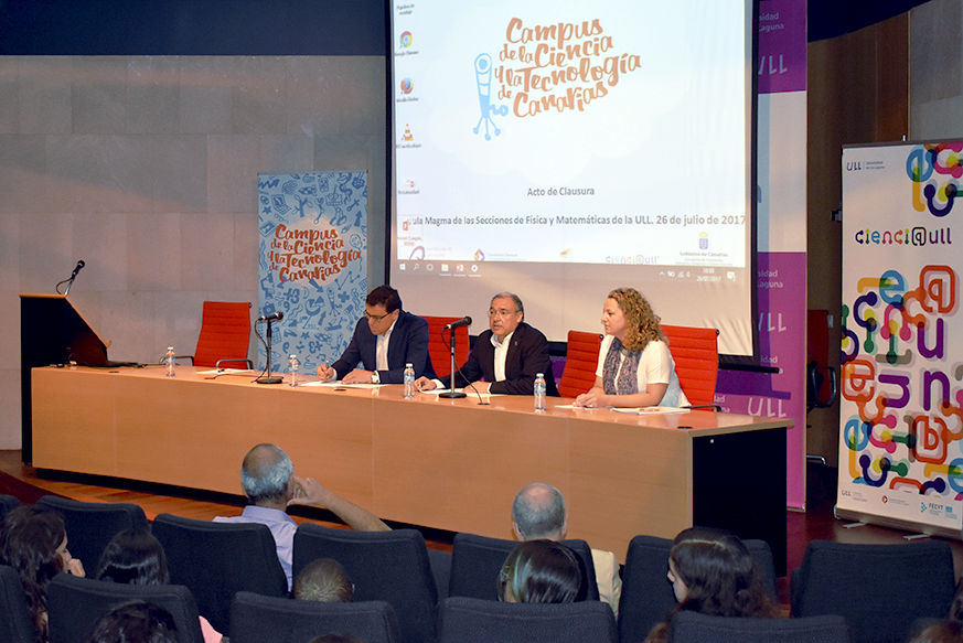 En el acto estuvieron presentes el director de la Agencia Canaria de Investigación, Innovación y Sociedad de la Información (ACIISI), Manuel Miranda, el vicerrector de Investigación de la ULL, Francisco Almeida, el director científico del CCT Canarias, Antonio Darwich, y la representante del Área de Educación y Cultura de la Fundación DISA, Marta López. Dichas entidades colaboran en la organización de este proyecto, que nace en el seno de las universidades canarias a través de sus Unidades de Cultura Científica y de la Innovación, la Fundación General de la Universidad de La laguna y la Fundación Canaria Parque Científico Tecnológico de la ULPGC. La actual edición se ha celebrado del 26 de junio al 21 de julio con la participación de 120 estudiantes totales.