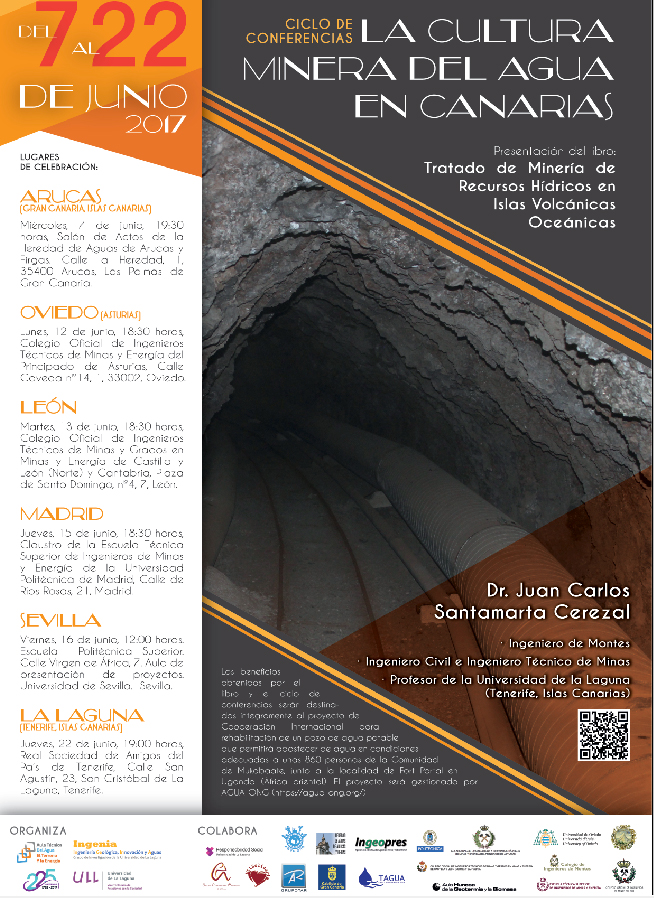 El profesor de la Escuela Politécnica Superior de Ingeniería de la Universidad de La Laguna, Juan Carlos Santamarta, acomete un ciclo de charlas entre el 7 y el 22 de junio donde quedará patente la importancia de los recursos hídricos en las Islas Canarias, no sólo en las islas donde se domina desde hace más de 100 años esta técnica, si no en otras regiones mineras del país, con el fin de crear conexiones para futuros proyectos de investigación y mejora de las técnicas y seguridad en la gestión de las infraestructuras. Además, pone de manifiesto las dificultades técnicas y el esfuerzo realizado para poder abastecer de recursos hídricos un sistema insular como el canario donde escasea el agua.